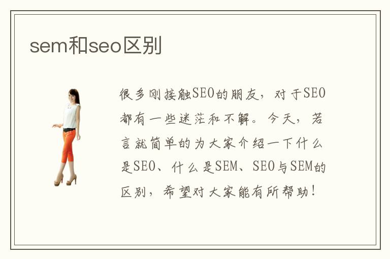 很多剛接觸SEO的朋友,對于SEO都有一些迷茫和不解。今天,若言就簡單的為大家介紹一下什么是SEO、什么是SEM、SEO與SEM的區(qū)別,希望對大家能有所幫助! 搜索引擎優(yōu)