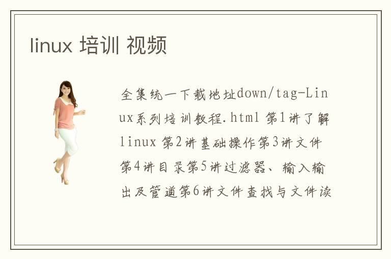 全集統(tǒng)一下載地址down/tag-Linux系列培訓(xùn)教程.html 第1講了解linux 第2講基礎(chǔ)操作第3講文件第4講目錄第5講過濾器、輸入輸出及管道第6講文件查找與文件
