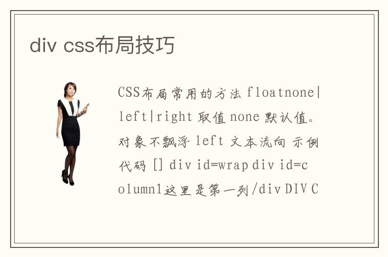 CSS布局常用的方法 floatnone|left|right 取值 none 默認值。對象不飄浮 left 文本流向 示例代碼 [] <div id="wrap"> <div id="column1">這里是第一列</div>