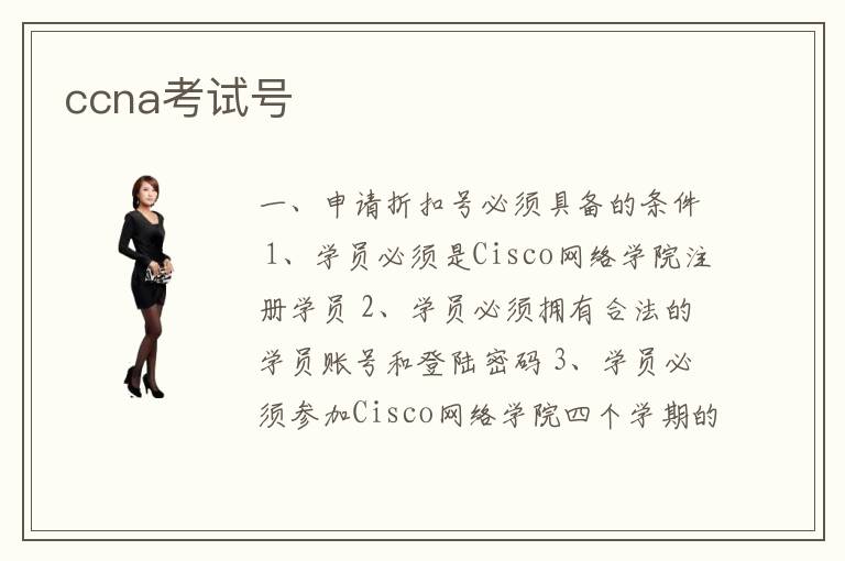 一、申請折扣號必須具備的條件 1、學(xué)員必須是Cisco網(wǎng)絡(luò)學(xué)院注冊學(xué)員 2、學(xué)員必須擁有合法的學(xué)員賬號和登陸密碼 3、學(xué)員必須參加Cisco網(wǎng)絡(luò)學(xué)院四個學(xué)期的在線考試并且每