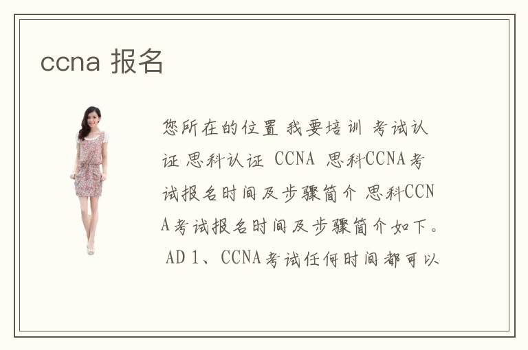 您所在的位置 我要培訓(xùn) >考試認(rèn)證 >思科認(rèn)證 > CCNA > 思科CCNA考試報(bào)名時(shí)間及步驟簡(jiǎn)介 思科CCNA考試報(bào)名時(shí)間及步驟簡(jiǎn)介如下。 AD 1、CCNA考試任何時(shí)間都可以報(bào)名