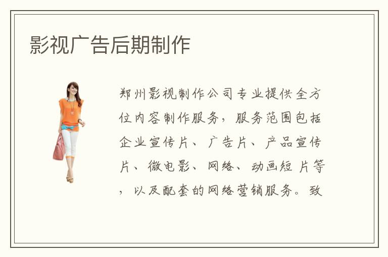 慧聰網(wǎng)影視廣告后期制作產(chǎn)品庫,集合了關(guān)于影視廣告后期制作的豐富內(nèi)容,為用戶提供各種影視廣告后期制作的供求信息價格,影視廣告后期制作資訊,影視廣告后期制作圖片,