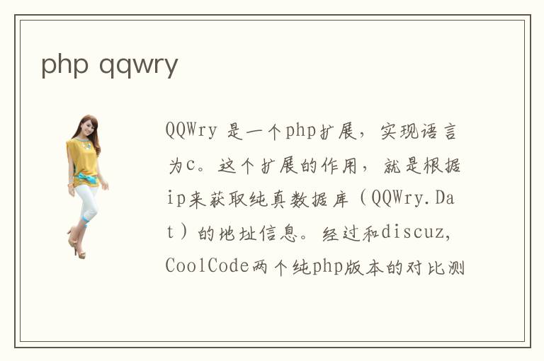 QQWry 是一個(gè)php擴(kuò)展,實(shí)現(xiàn)語(yǔ)言為c。這個(gè)擴(kuò)展的作用,就是根據(jù)ip來(lái)獲取純真數(shù)據(jù)庫(kù)(QQWry.Dat)的地址信息。經(jīng)過(guò)和discuz,CoolCode兩個(gè)純php版本的對(duì)比測(cè)試,這個(gè)c實(shí)現(xiàn)