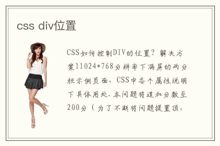 CSS如何控制DIV的位置?解決方案11024*768分辨率下滿屏的兩分欄示例頁(yè)面,CSS中各個(gè)屬性說明下具體用處.本問題將追加分?jǐn)?shù)至200分(為了不斷將問題提置頂,結(jié)貼前補(bǔ)