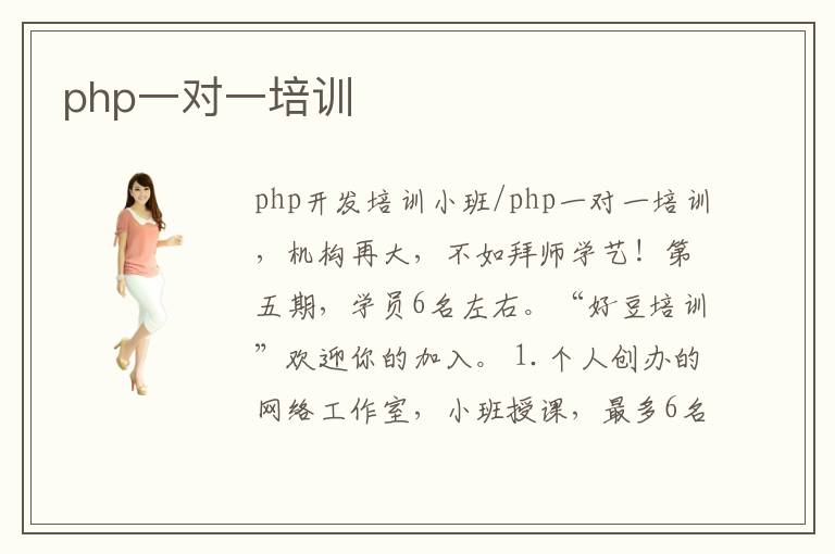 php開發(fā)培訓(xùn)小班/php一對一培訓(xùn),機構(gòu)再大,不如拜師學(xué)藝!第五期,學(xué)員6名左右?!昂枚古嘤?xùn)”歡迎你的加入。 1.個人創(chuàng)辦的網(wǎng)絡(luò)工作室,小班授課,最多6名學(xué)員。 2.時間三