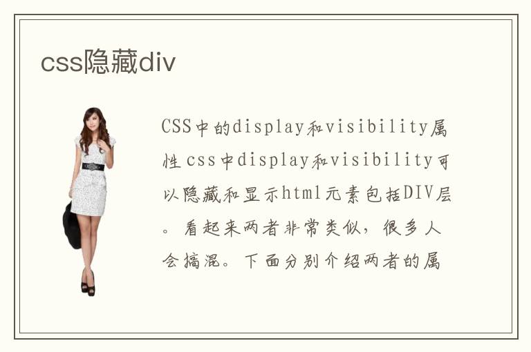 CSS中的display和visibility屬性 css中display和visibility可以隱藏和顯示html元素包括DIV層。看起來兩者非常類似,很多人會搞混。下面分別介紹兩者的屬性 displaynone|block;