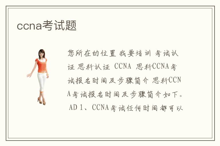 您所在的位置 我要培訓(xùn) >考試認(rèn)證 >思科認(rèn)證 > CCNA > 思科CCNA考試報(bào)名時(shí)間及步驟簡(jiǎn)介 思科CCNA考試報(bào)名時(shí)間及步驟簡(jiǎn)介如下。 AD 1、CCNA考試任何時(shí)間都可以報(bào)名
