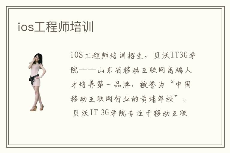 iOS工程師培訓(xùn)招生,貝沃IT3G學(xué)院----山東省移動互聯(lián)網(wǎng)高端人才培養(yǎng)第一品牌,被譽(yù)為“中國移動互聯(lián)網(wǎng)行業(yè)的黃埔軍?!?。 貝沃IT 3G學(xué)院專注于移動互聯(lián)網(wǎng)領(lǐng)域的研究,致力