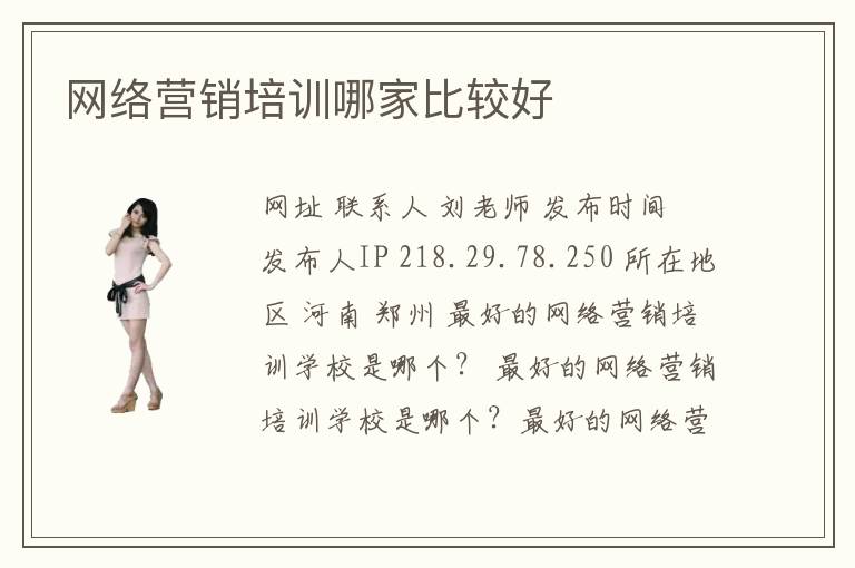 網(wǎng)址 聯(lián)系人 劉老師 發(fā)布時間 發(fā)布人IP 218.29.78.250 所在地區(qū) 河南 鄭州 最好的網(wǎng)絡(luò)營銷培訓(xùn)學(xué)校是哪個? 最好的網(wǎng)絡(luò)營銷培訓(xùn)學(xué)校是哪個?最好的網(wǎng)絡(luò)營銷培訓(xùn)學(xué)校是