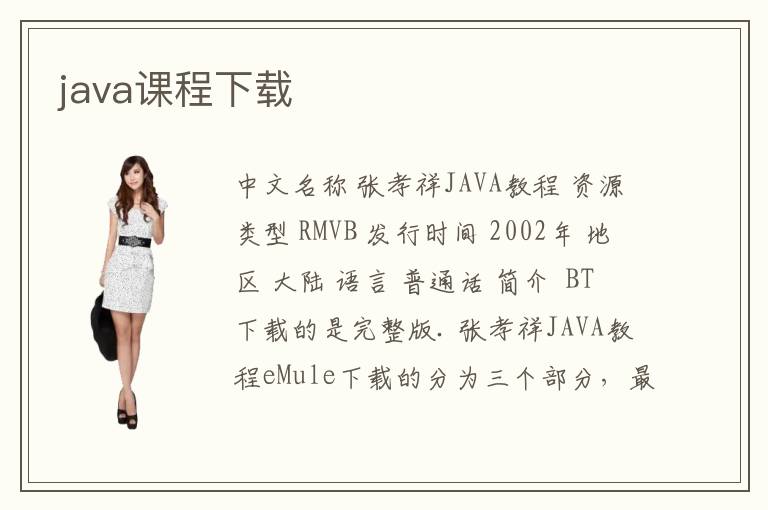 中文名稱 張孝祥JAVA教程 資源類型 RMVB 發(fā)行時間 2002年 地區(qū) 大陸 語言 普通話 簡介 BT下載的是完整版. 張孝祥JAVA教程eMule下載的分為三個部分,