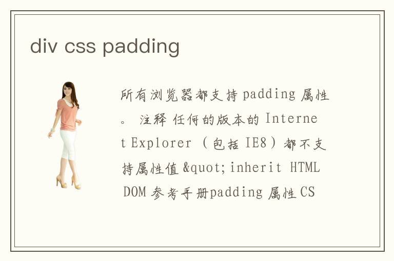 所有瀏覽器都支持 padding 屬性。 注釋 任何的版本的 Internet Explorer (包括 IE8)都不支持屬性值 \"inherit HTML DOM 參考手冊padding 屬性 CSS 參考手冊