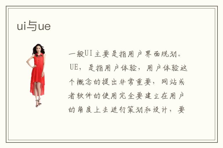 一般UI主要是指用戶界面規(guī)劃。 UE,是指用戶體驗(yàn),用戶體驗(yàn)這個(gè)概念的提出非常重要,網(wǎng)站或者軟件的使用完全要建立在用戶的角度上去進(jìn)行策劃和設(shè)計(jì),要從多個(gè)角度去試驗(yàn)