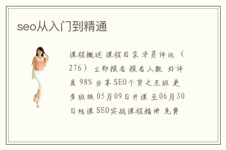 課程概述 課程目錄 學(xué)員評論 (276) 立即報名 報名人數(shù) 好評度 98% 分享 SEO干貨之王班 更多班級 05月09日開課 至06月30日結(jié)課 SEO實戰(zhàn)課程精講 免費(fèi) 立即報名 收藏