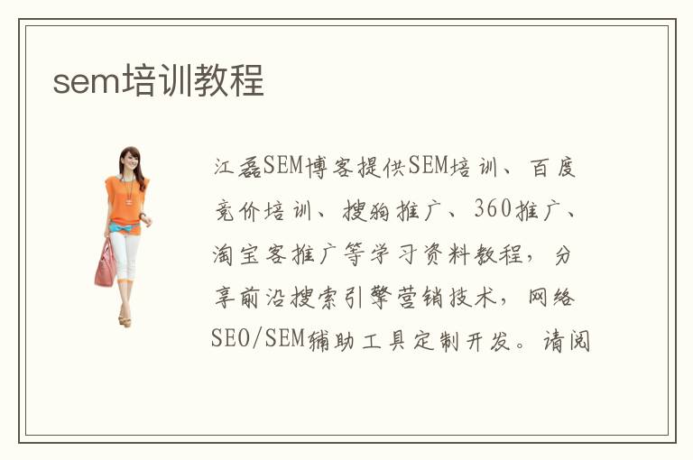 江磊SEM博客提供SEM培訓(xùn)、百度競價培訓(xùn)、搜狗推廣、360推廣、淘寶客推廣等學(xué)習(xí)資料教程,分享前沿搜索引擎營銷技術(shù),網(wǎng)絡(luò)SEO/SEM輔助工具定制開發(fā)。