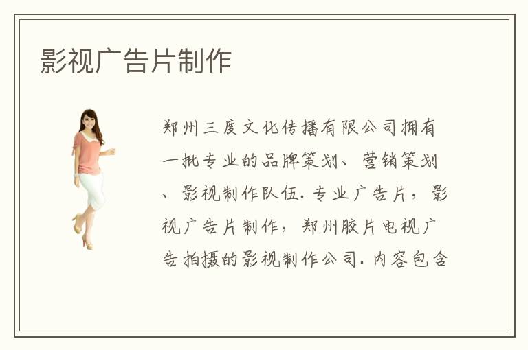 鄭州三度文化傳播有限公司擁有一批專業(yè)的品牌策劃、營銷策劃、影視制作隊伍.專業(yè)廣告片,影視廣告片制作,鄭州膠片電視廣告拍攝的影視制作公司.內(nèi)容包含電影、電視劇、廣