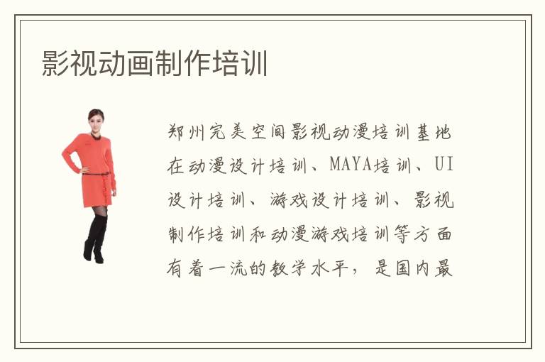 鄭州完美空間影視動漫培訓動漫培訓基地動漫設計培訓、MAYA培訓、UI設計培訓、游戲設計培訓、影視制作培訓和動漫游戲培訓等方面有著一流的教學水平,是國內最具實力游戲、影視