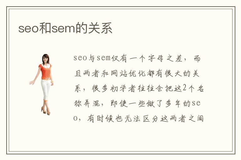 seo與sem的關(guān)系和區(qū)別 seo與sem僅有一個字母之差,而且兩者和網(wǎng)站優(yōu)化都有很大的關(guān)系,很多初學者往往會把這2個名稱弄混,即使一些做了多年的seo,有時候也無法區(qū)分這