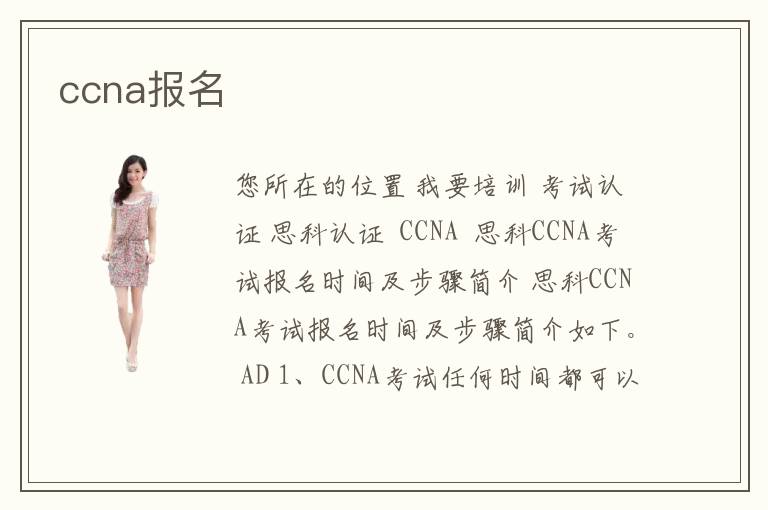 您所在的位置 我要培訓(xùn) >考試認(rèn)證 >思科認(rèn)證 > CCNA > 思科CCNA考試報(bào)名時(shí)間及步驟簡介 思科CCNA考試報(bào)名時(shí)間及步驟簡介如下。 AD 1、CCNA考試任何時(shí)間都可以報(bào)名