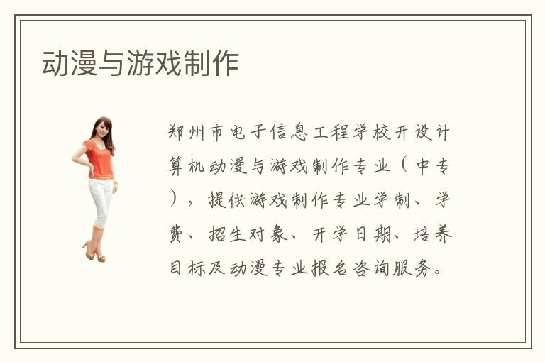 鄭州市電子信息工程學(xué)校開設(shè)計(jì)算機(jī)動(dòng)漫與游戲制作專業(yè)(中專),提供游戲制作專業(yè)學(xué)制、學(xué)費(fèi)、招生對象、開學(xué)日期、培養(yǎng)目標(biāo)及動(dòng)漫專業(yè)報(bào)名咨詢服務(wù)。