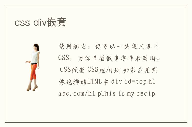 使用組合,你可以一次定義多個CSS,為你節(jié)省很多字節(jié)和時間。 CSS嵌套 CSS結(jié)構(gòu)好 如果應(yīng)用到像這樣的HTML中 <div id="top"> <h1>abc.com</h1> <p>This is my recipe