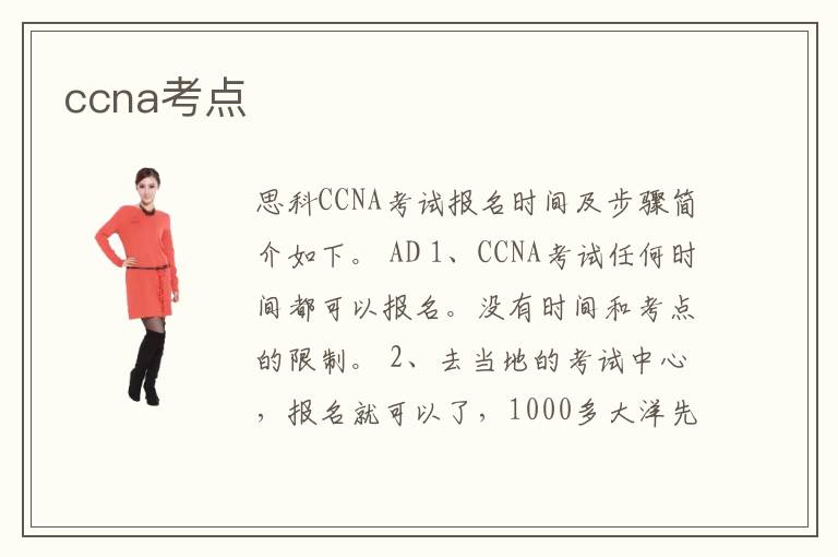 思科CCNA考試報名時間及步驟簡介如下。 AD 1、CCNA考試任何時間都可以報名。沒有時間和考點的限制。 2、去當(dāng)?shù)氐目荚囍行模瑘竺涂梢粤耍?000多大洋先準(zhǔn)備好。具體