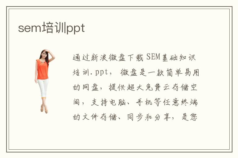 通過新浪微盤下載 SEM基礎(chǔ)知識(shí)培訓(xùn).ppt, 微盤是一款簡單易用的網(wǎng)盤,提供超大免費(fèi)云存儲(chǔ)空間,支持電腦、手機(jī)等任意終端的文件存儲(chǔ)、同步和分享,是您工作、學(xué)習(xí)、生活