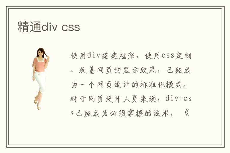 使用div搭建框架,使用css定制、改善網(wǎng)頁(yè)的顯示效果,已經(jīng)成為一個(gè)網(wǎng)頁(yè)設(shè)計(jì)的標(biāo)準(zhǔn)化模式。對(duì)于網(wǎng)頁(yè)設(shè)計(jì)人員來(lái)說(shuō),div+css已經(jīng)成為必須掌握的技術(shù)。 《精通div+css網(wǎng)頁(yè)樣式