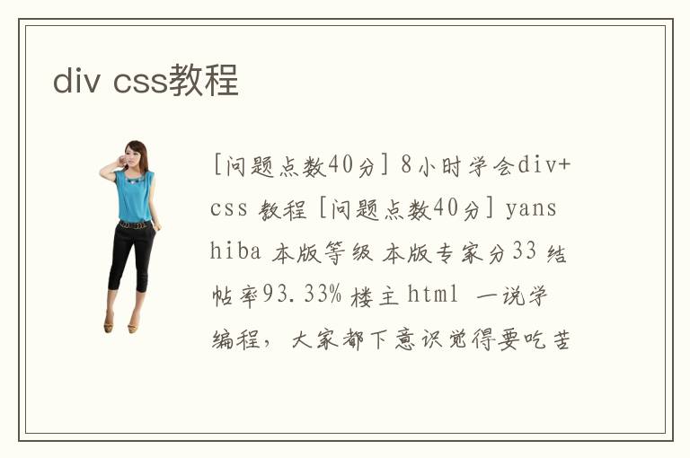 [問(wèn)題點(diǎn)數(shù)40分] 8小時(shí)學(xué)會(huì)div+css 教程 [問(wèn)題點(diǎn)數(shù)40分] yanshiba 本版等級(jí) 本版專家分33 結(jié)帖率93.33% 樓主 html 一說(shuō)學(xué)編程,大家都下意識(shí)覺(jué)得要"吃苦",