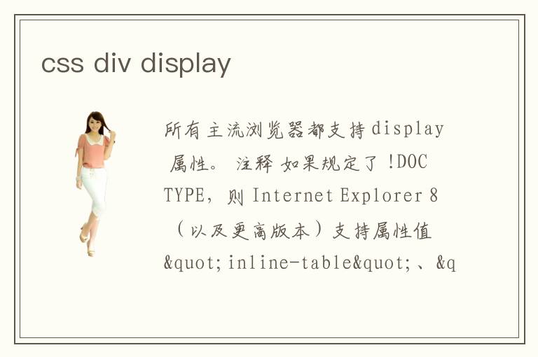 所有主流瀏覽器都支持 display 屬性。 注釋 如果規(guī)定了 !DOCTYPE,則 Internet Explorer 8 (以及更高版本)支持屬性值 \"inline-table\"、\"run-in\"、\"table\"、\"table-caption