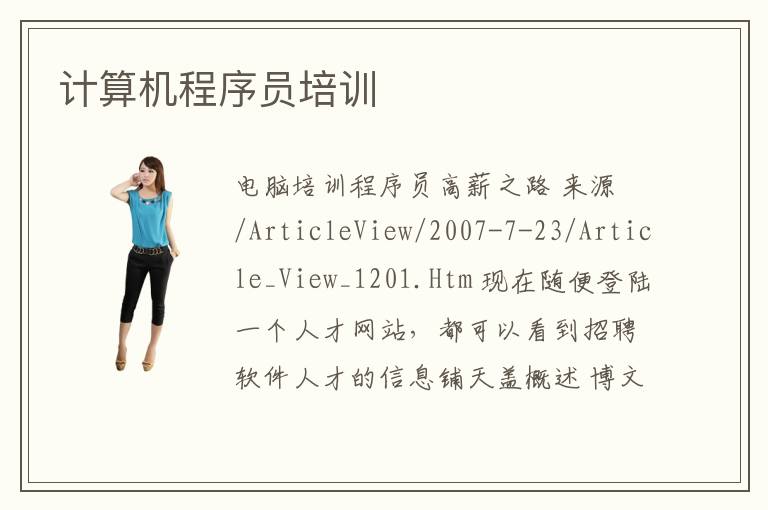 電腦培訓(xùn)程序員高薪之路 來源 /ArticleView/2007-7-23/Article_View_1201.Htm 現(xiàn)在隨便登陸一個(gè)人才網(wǎng)站,都可以看到招聘軟件人才的信息鋪天蓋