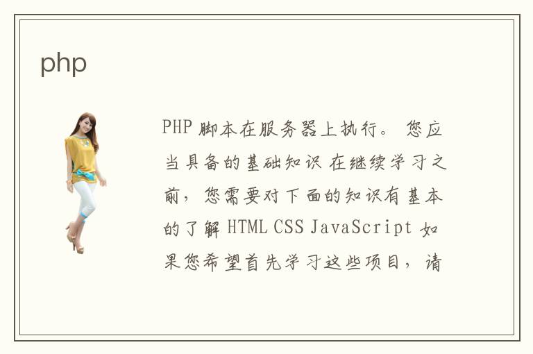 PHP 腳本在服務(wù)器上執(zhí)行。 您應(yīng)當(dāng)具備的基礎(chǔ)知識 在繼續(xù)學(xué)習(xí)之前,您需要對下面的知識有基本的了解 HTML CSS JavaScript 如果您希望首先學(xué)習(xí)這些項(xiàng)目,請?jiān)谖覀兊氖醉?