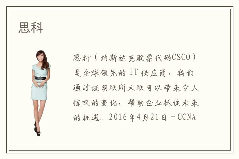 思科公司是全球領(lǐng)先的互聯(lián)網(wǎng)設備供應商,1984年由斯坦福大學的一對教授夫婦創(chuàng)立,總部位于美國加利福尼亞州的圣何塞。思科向客戶提供端到端的網(wǎng)絡方案,使客戶能夠建立起