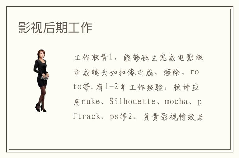 工作職責(zé)1、能夠獨立完成電影級合成鏡頭如扣像合成、擦除、roto等.有1-2年工作經(jīng)驗,軟件應(yīng)用nuke、Silhouette、mocha、pftrack、ps等2、負(fù)責(zé)影視特效后期合成;3、能獨