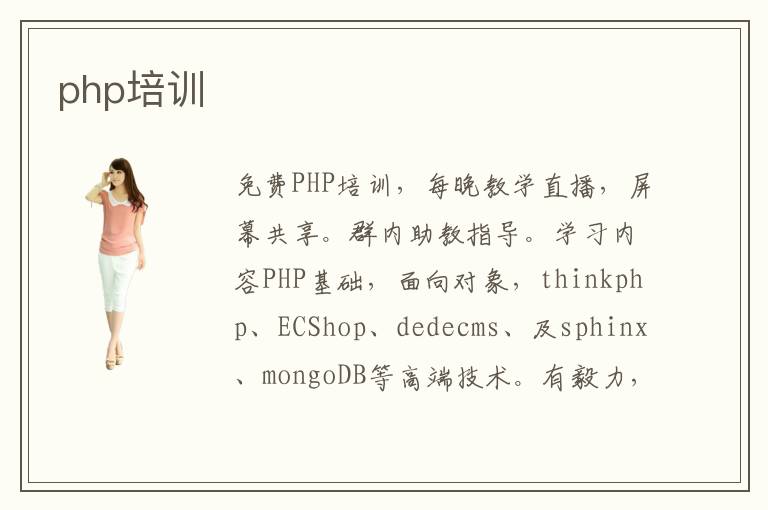 免費PHP培訓,每晚教學直播,屏幕共享。群內(nèi)助教指導。學習內(nèi)容PHP基礎,面向?qū)ο?,thinkphp、ECShop、dedecms、及sphinx、mongoDB等高端技術(shù)。有毅力,來自學!