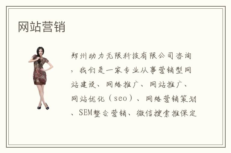 鄭州動力無限科技有限公司咨詢,我們是一家專業(yè)從事營銷型網(wǎng)站建設、網(wǎng)絡推廣、網(wǎng)站推廣、網(wǎng)站優(yōu)化(seo)、網(wǎng)絡營銷策劃、SEM整合營銷、微信搜索推
