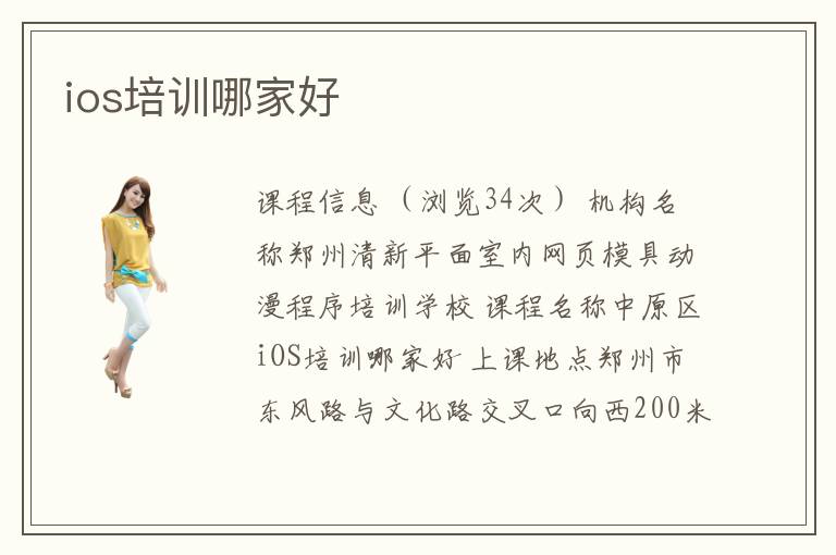 課程信息 (瀏覽34次) 機構(gòu)名稱鄭州清新平面室內(nèi)網(wǎng)頁模具動漫程序培訓(xùn)學(xué)校 課程名稱中原區(qū)iOS培訓(xùn)哪家好 上課地點鄭州市東風(fēng)路與文化路交叉口向西200米路北匯寶大