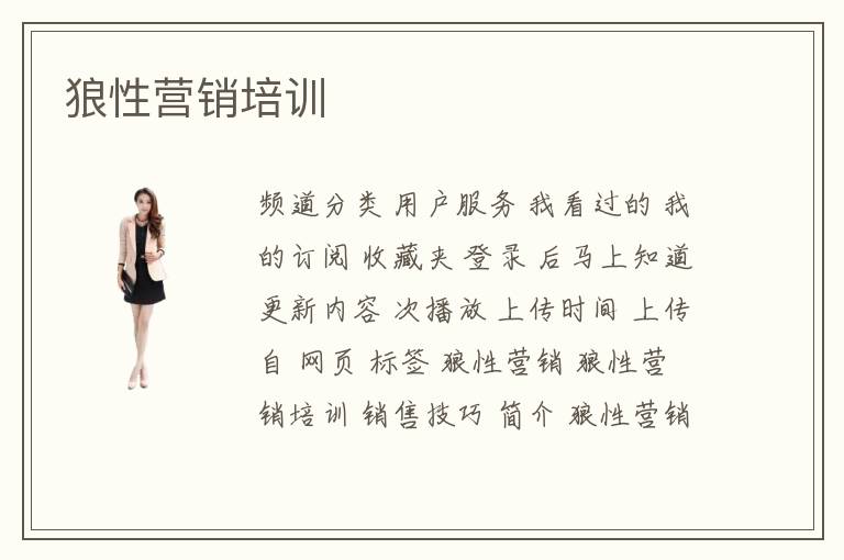 頻道分類 用戶服務(wù) 我看過的 我的訂閱 收藏夾 登錄 后馬上知道更新內(nèi)容 次播放 上傳時(shí)間 上傳自 網(wǎng)頁 標(biāo)簽 狼性營銷 狼性營銷培訓(xùn) 銷售技巧 簡介 狼性營銷 狼性營銷培訓(xùn)