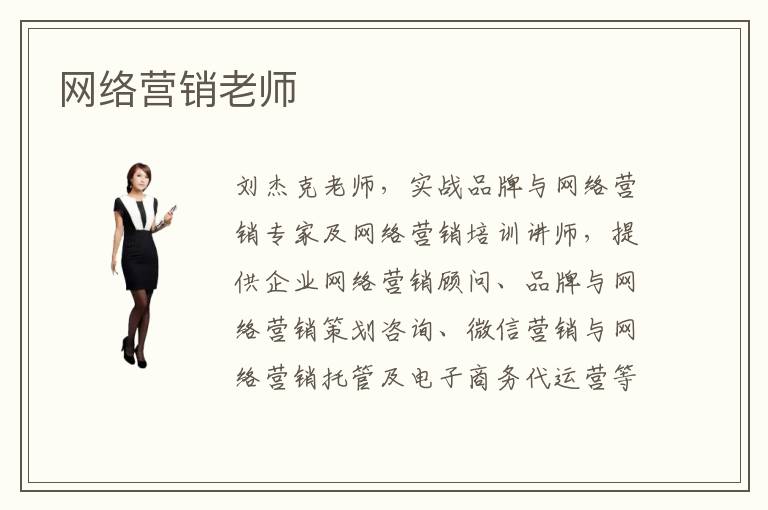 劉杰克老師,實(shí)戰(zhàn)品牌與網(wǎng)絡(luò)營(yíng)銷專家及網(wǎng)絡(luò)營(yíng)銷培訓(xùn)講師,提供企業(yè)網(wǎng)絡(luò)營(yíng)銷顧問(wèn)、品牌與網(wǎng)絡(luò)營(yíng)銷策劃咨詢、微信營(yíng)銷與網(wǎng)絡(luò)營(yíng)銷托管及電子商務(wù)代運(yùn)營(yíng)等服務(wù),010-