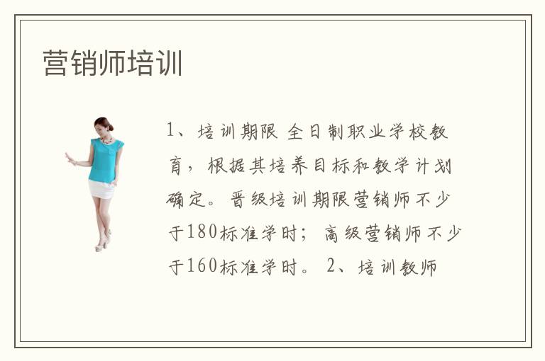 1、培訓(xùn)期限 全日制職業(yè)學(xué)校教育,根據(jù)其培養(yǎng)目標(biāo)和教學(xué)計(jì)劃確定。晉級(jí)培訓(xùn)期限營銷師不少于180標(biāo)準(zhǔn)學(xué)時(shí);高級(jí)營銷師不少于160標(biāo)準(zhǔn)學(xué)時(shí)。 2、培訓(xùn)教師 培訓(xùn)營銷師的教