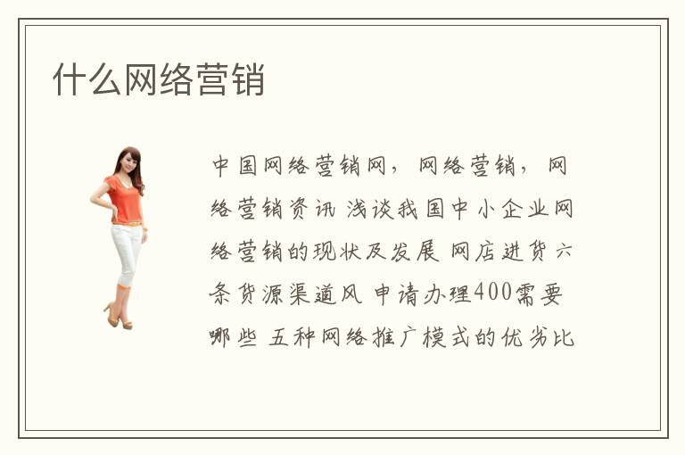 中國網(wǎng)絡(luò)營銷網(wǎng),網(wǎng)絡(luò)營銷,網(wǎng)絡(luò)營銷資訊 淺談我國中小企業(yè)網(wǎng)絡(luò)營銷的現(xiàn)狀及發(fā)展 網(wǎng)店進貨六條貨源渠道風 申請辦理400需要哪些 五種網(wǎng)絡(luò)推廣模式的優(yōu)劣比較 什么是搜