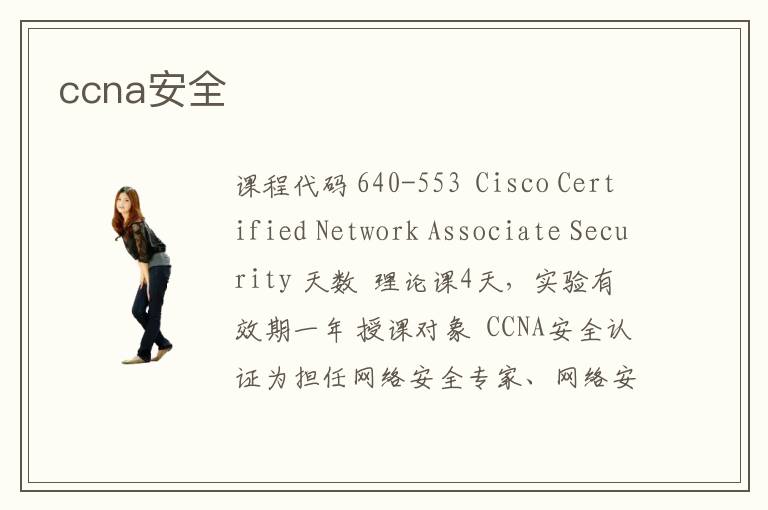 課程代碼 640-553 Cisco Certified Network Associate Security 天數(shù) 理論課4天,實驗有效期一年 授課對象 CCNA安全認證為擔任網(wǎng)絡(luò)安全專家、網(wǎng)絡(luò)安全管理員和網(wǎng)絡(luò)安