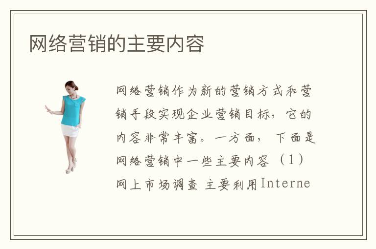 網(wǎng)絡(luò)營銷作為新的營銷方式和營銷手段實現(xiàn)企業(yè)營銷目標,它的內(nèi)容非常豐富。一方面, 下面是網(wǎng)絡(luò)營銷中一些主要內(nèi)容 (1)網(wǎng)上市場調(diào)查 主要利用Internet 交互式的信息溝