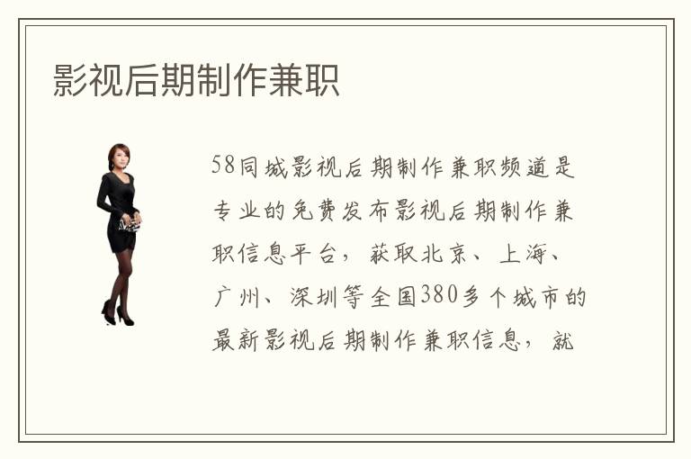 58同城影視后期制作兼職頻道是專業(yè)的免費(fèi)發(fā)布影視后期制作兼職信息平臺(tái),獲取北京、上海、廣州、深圳等全國380多個(gè)城市的最新影視后期制作兼職信息,就來58同城。