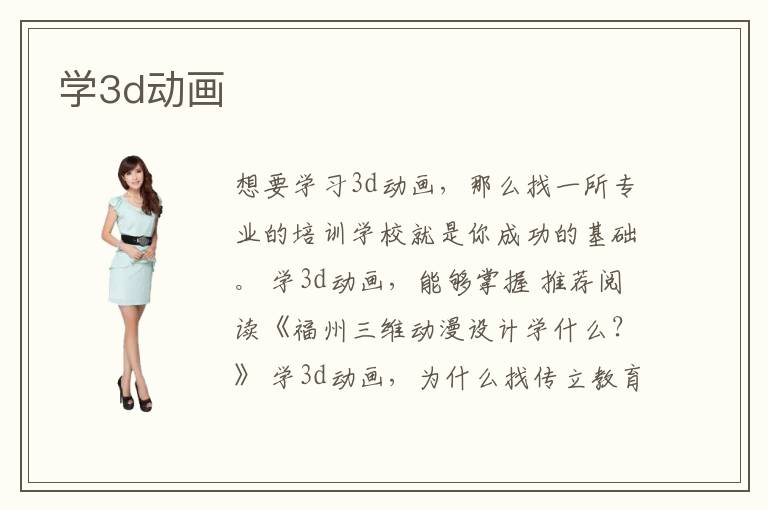 介紹,想要學(xué)習(xí)3d動(dòng)畫,那么找一所專業(yè)的培訓(xùn)學(xué)校就是你成功的基礎(chǔ)。 學(xué)3d動(dòng)畫,能 推薦閱讀 《 福州三維動(dòng)漫設(shè)計(jì)學(xué)什么? 》 學(xué)3d動(dòng)畫,為什么找傳立教育? 福州傳立教