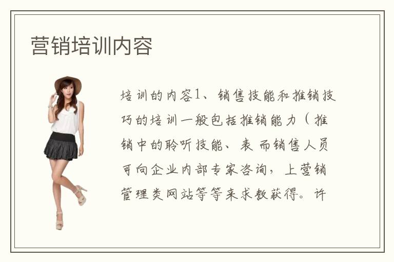 薈萃豐富的營(yíng)銷培訓(xùn)內(nèi)容知識(shí)及案例。在這里,您既可體驗(yàn)鮮活而精彩的營(yíng)銷培訓(xùn)內(nèi)容知識(shí),文章,又可聆聽(tīng)專家的相關(guān)解答,與廣大經(jīng)理人和精英在線探討豐富的營(yíng)銷培訓(xùn)內(nèi)容案