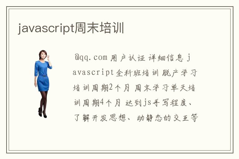 @qq.com 用戶認證 詳細信息 javascript全科班培訓 脫產學習培訓周期2個月 周末學習單天培訓周期4個月 達到js手寫程度、了解開發(fā)思想、動靜態(tài)的交互等 聯