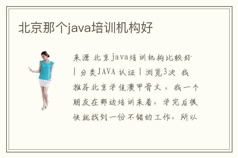 來(lái)源 北京java培訓(xùn)機(jī)構(gòu)比較好 | 分類JAVA 認(rèn)證 | 瀏覽3次 我推薦北京學(xué)佳澳甲骨文 ,我一個(gè)朋友在那邊培訓(xùn)來(lái)著,學(xué)完后很快就找到一份不錯(cuò)的工作,所以個(gè)人認(rèn)為那里應(yīng)該