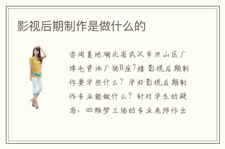 咨詢基地湖北省武漢市洪山區(qū)廣埠屯資訊廣場(chǎng)B座7樓 影視后期制作要學(xué)些什么?學(xué)好影視后期制作專業(yè)能做什么?針對(duì)學(xué)生的疑惑,四維夢(mèng)工場(chǎng)的專業(yè)老師作出如下說(shuō)明。 影視