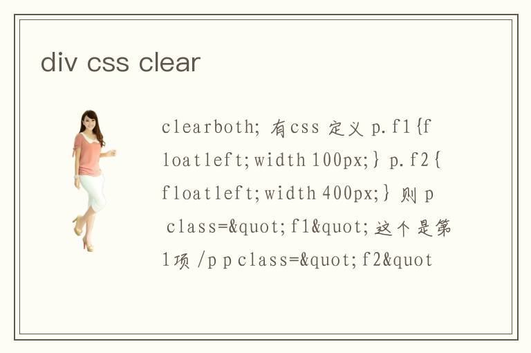 clearboth; 有css 定義 p.f1{floatleft;width 100px;} p.f2{floatleft;width 400px;} 則 <p class=\"f1\">這個是第1項 </p> <p class=\"f2\">這個是第2項 </p> <p >另起一行</p>
