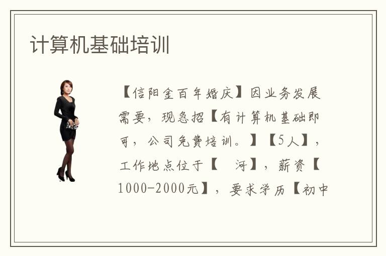【信陽金百年婚慶】因業(yè)務(wù)發(fā)展需要,現(xiàn)急招【有計(jì)算機(jī)基礎(chǔ)即可,公司免費(fèi)培訓(xùn)?!俊?人】,工作地點(diǎn)位于【浉河】,薪資【1000-2000元】,要求學(xué)歷【初中】,工作經(jīng)驗(yàn)【